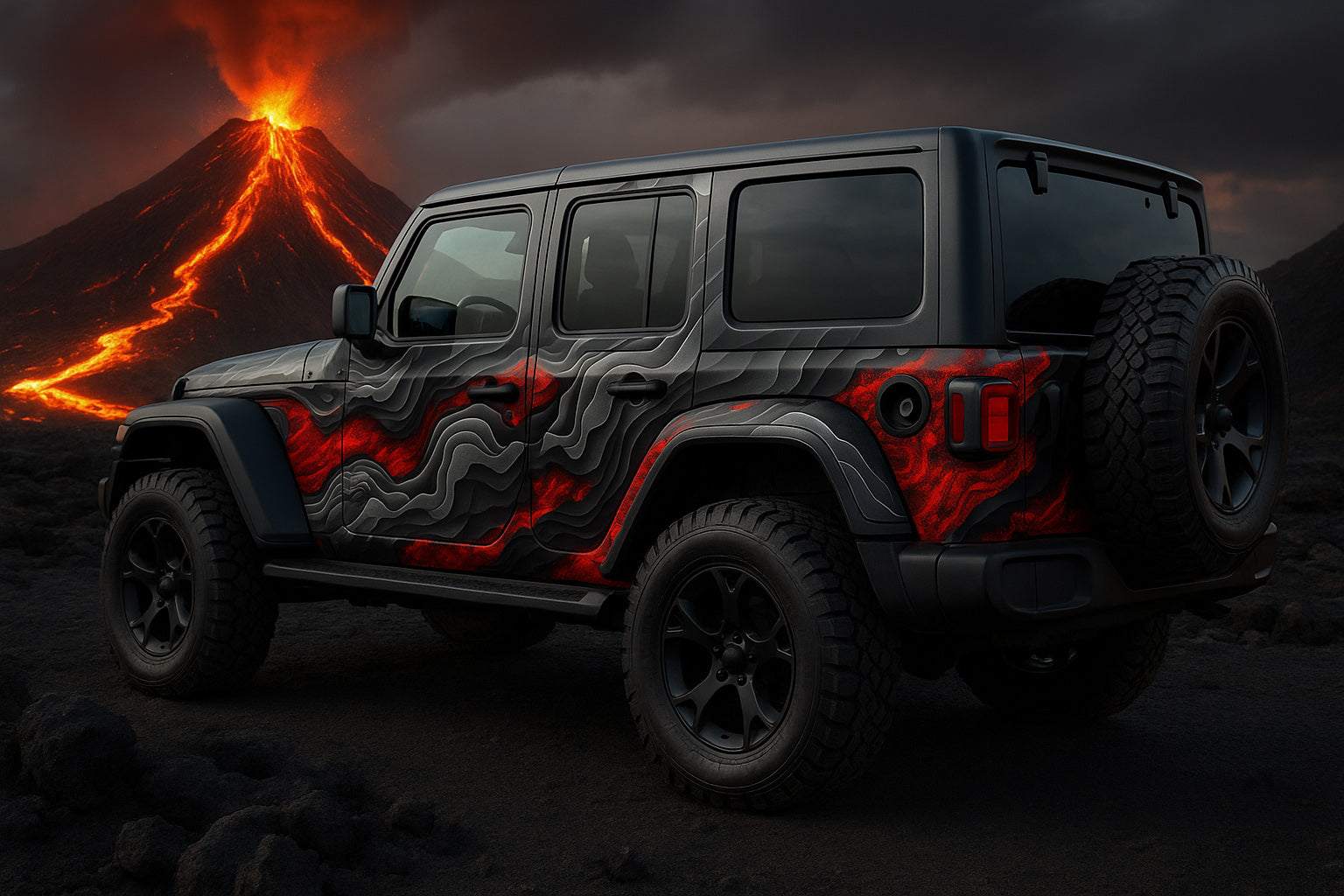 The Lava Flow Jeep Wrap by Stickalz transforms your off-road vehicle into a molten masterpiece. Featuring a striking 3D topographic design with glowing lava tones and black terrain contours, this wrap brings heat, power, and adventure to every trail.