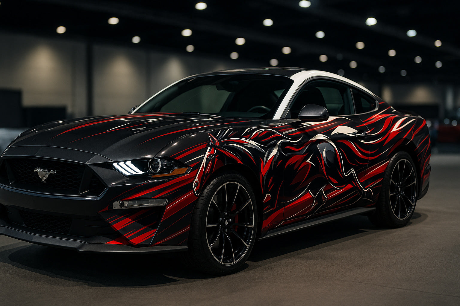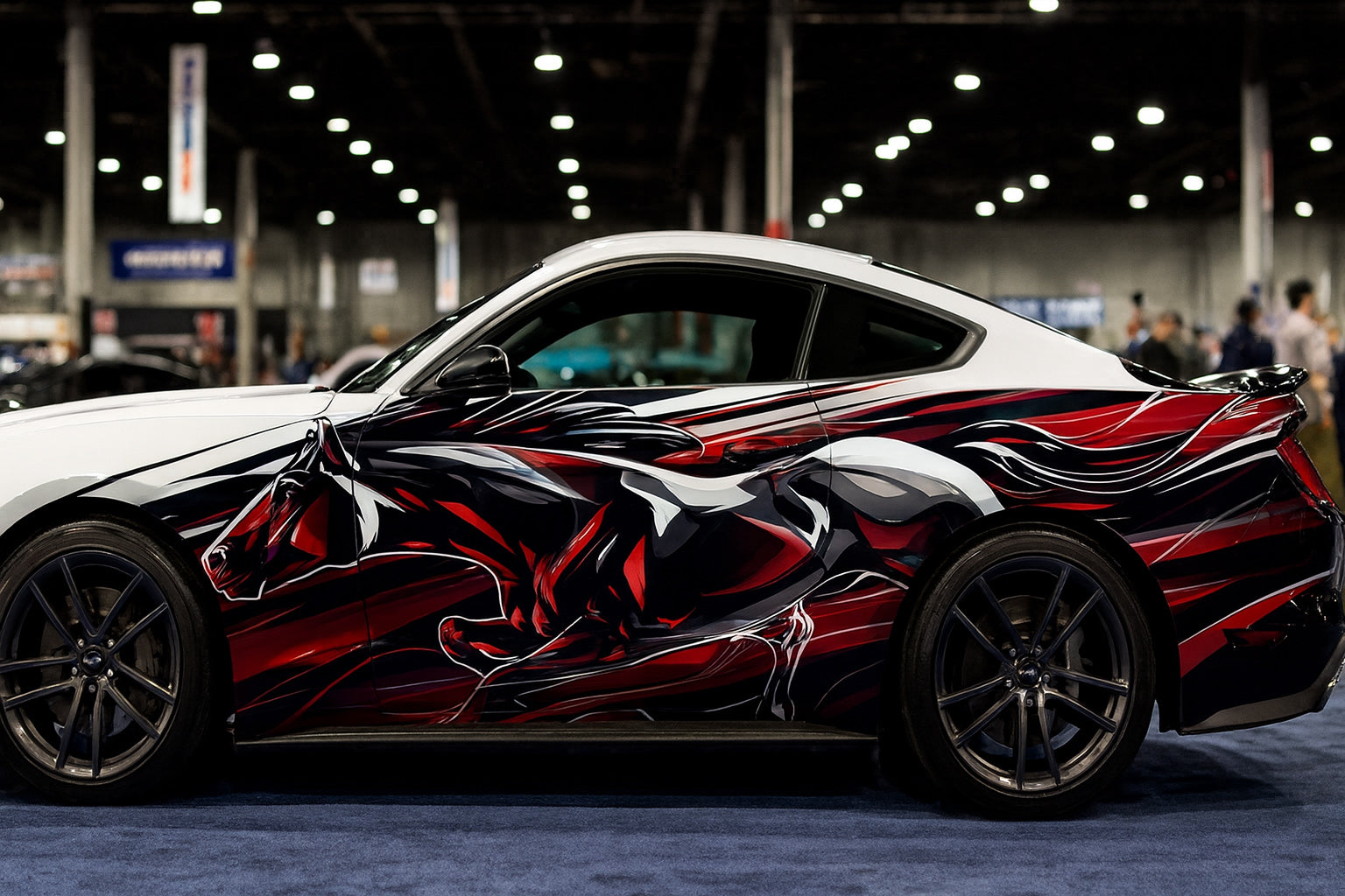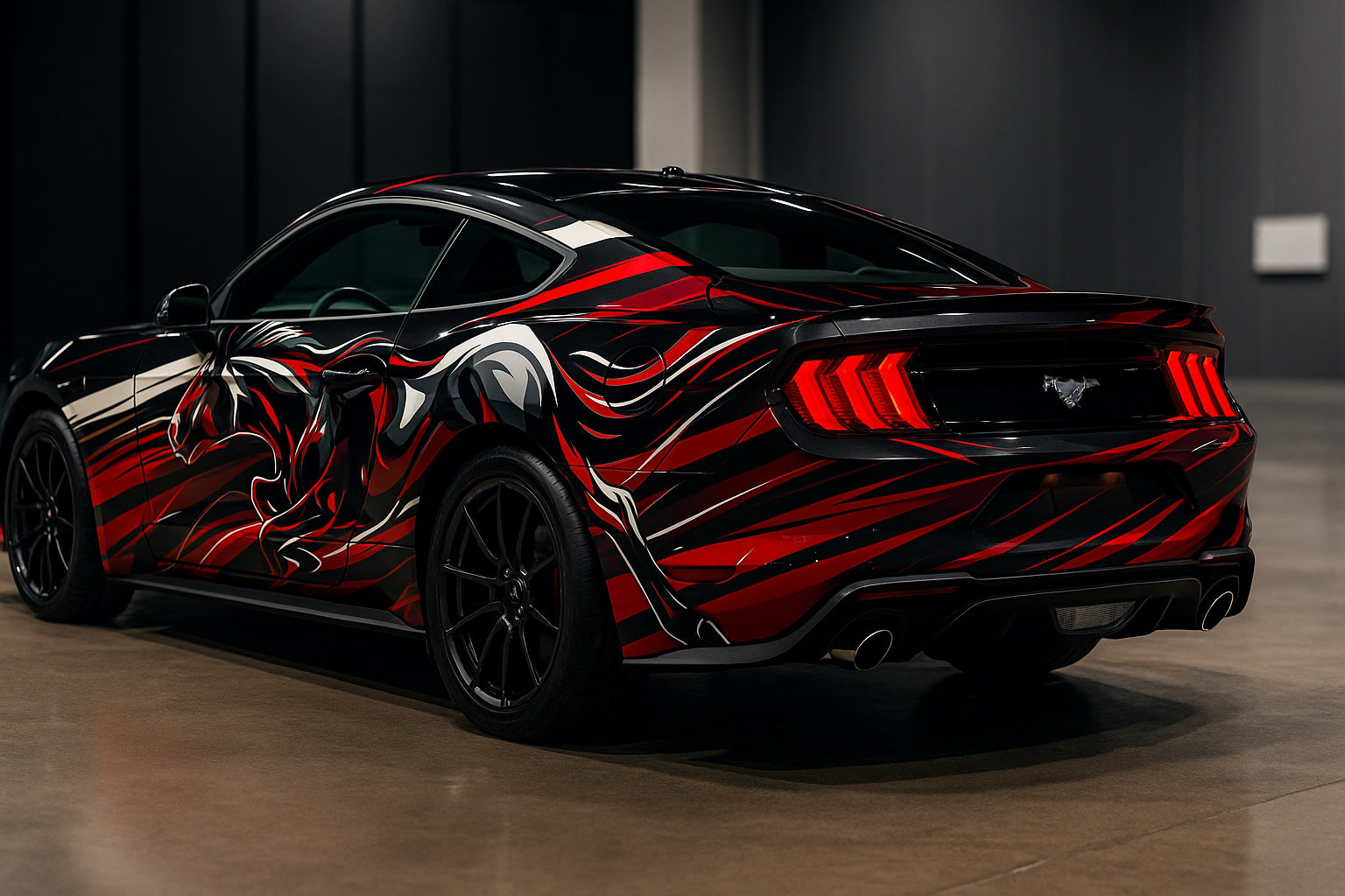 This exclusive full-body wrap features a charging metallic stallion intertwined with red and black flame streaks, symbolizing unstoppable speed and power. Designed for show cars and performance vehicles, it delivers a perfect mix of artistry and aggression.