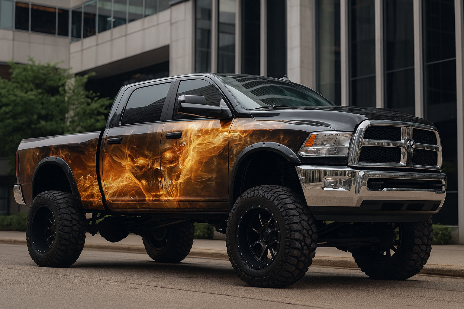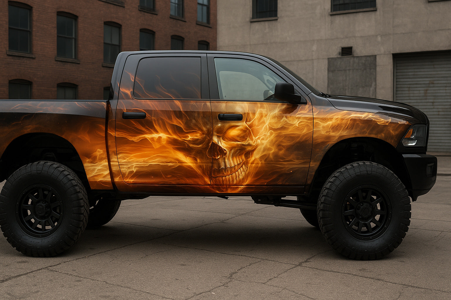 Unleash pure power with the Infernal Skull Fire Wrap by Stickalz — a jaw-dropping vinyl design that merges raw aggression with blazing artistry. Featuring a fiery skull engulfed in smoke and flames, this wrap gives your truck an unmistakable, menacing presence on the street or off-road.