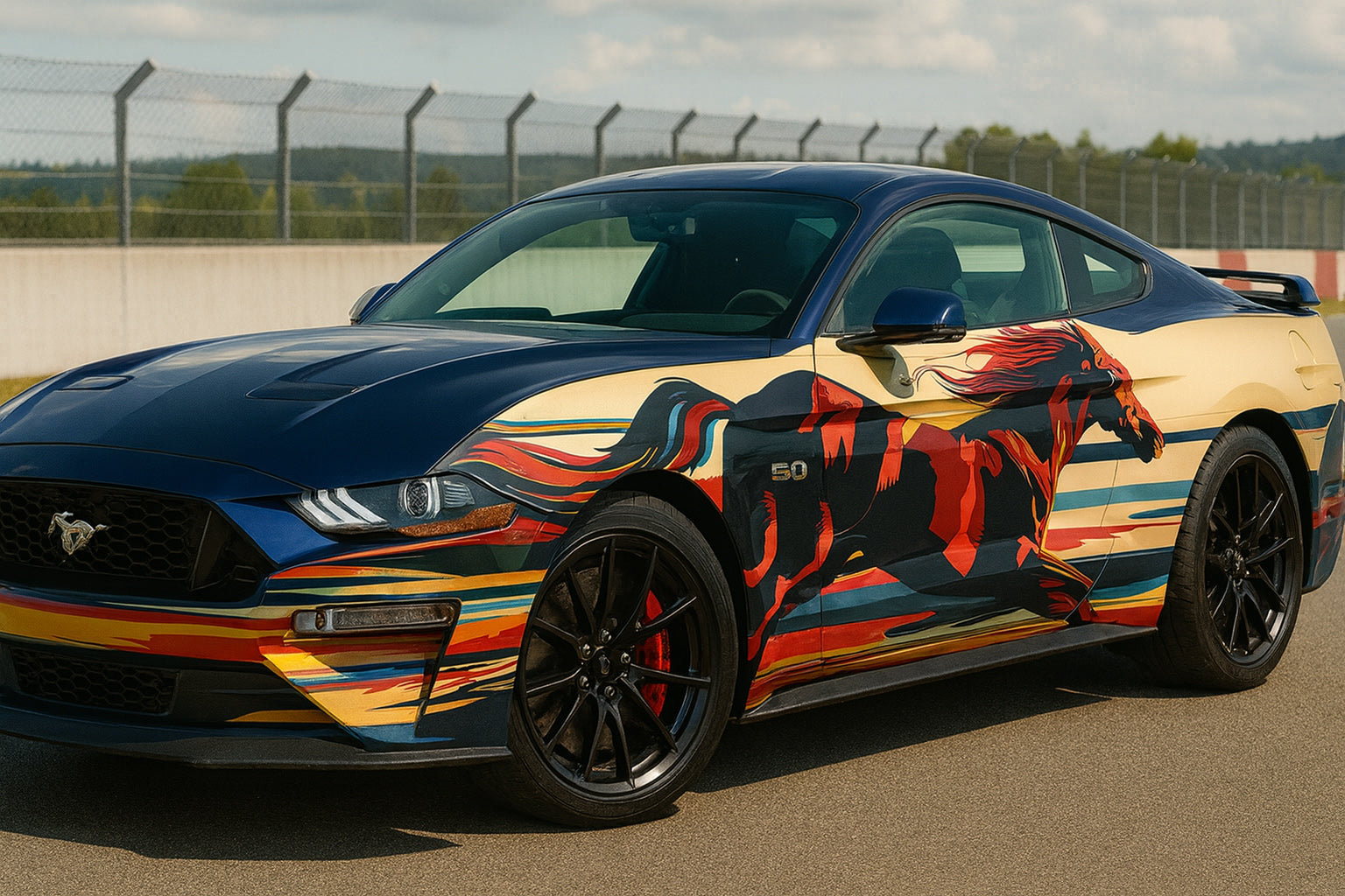 Designed for those who live fast and ride bold, this wrap blends retro Western artistry with modern muscle — featuring a dynamic galloping horse over sweeping streaks of red, gold, and navy. Perfect for Ford Mustang enthusiasts or anyone who wants their car to reflect raw horsepower and individuality.
