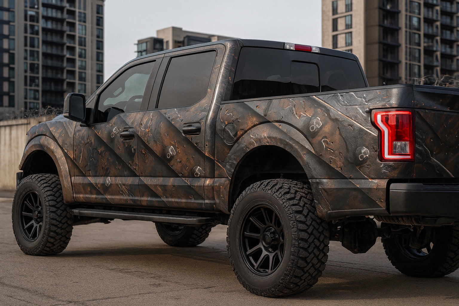 The Armored Steel Truck Wrap by Stickalz combines rugged realism with cutting-edge detail. Designed to look like riveted, rusted steel plating, this wrap gives your pickup a bold, mechanical personality that commands attention both on the streets and off-road trails.